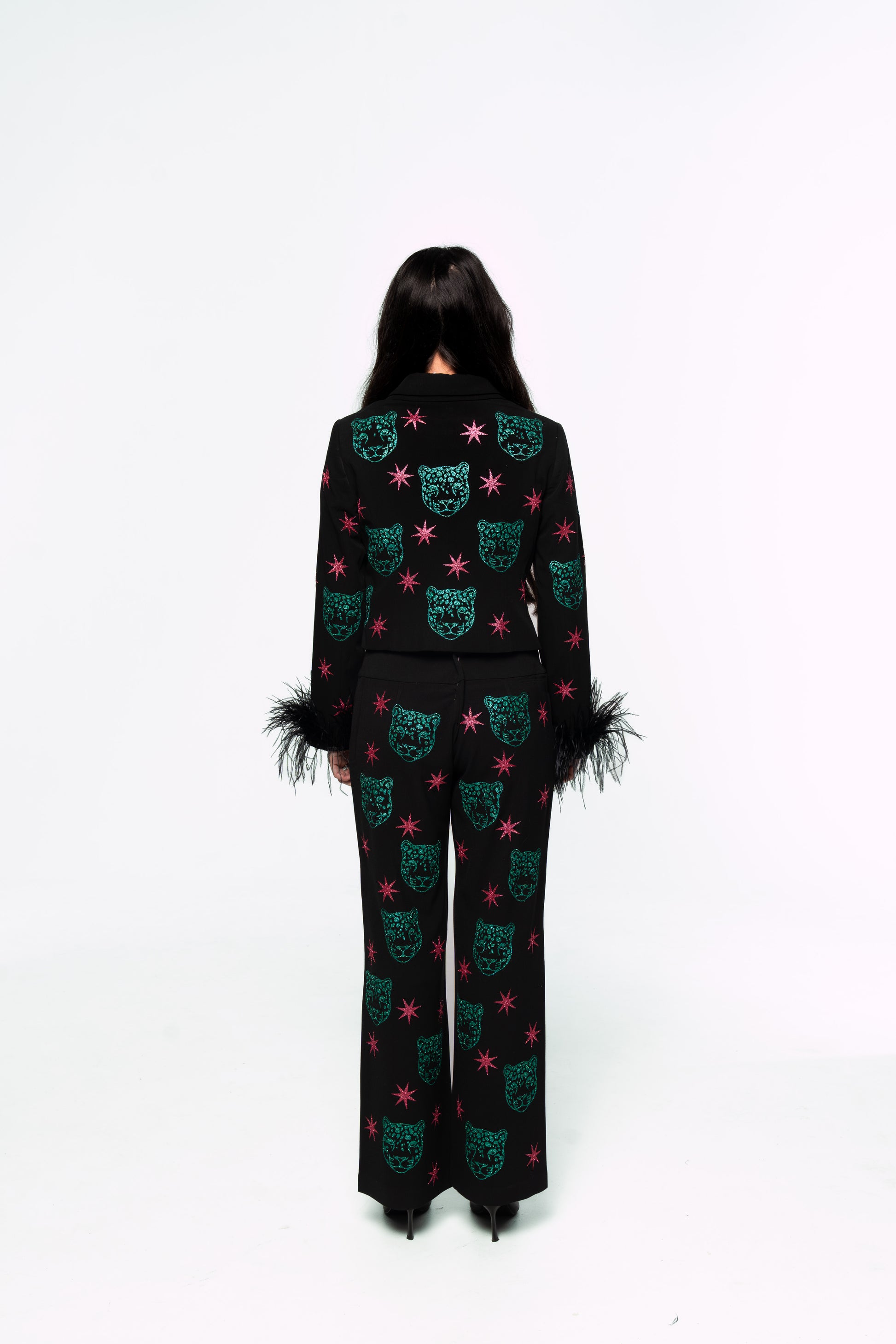 It's a show stopper!! This tuxedo style suit is decorated with green sparkling leopard faces and pink sparkly stars. Finished with luxurious feathers on the cuffs.