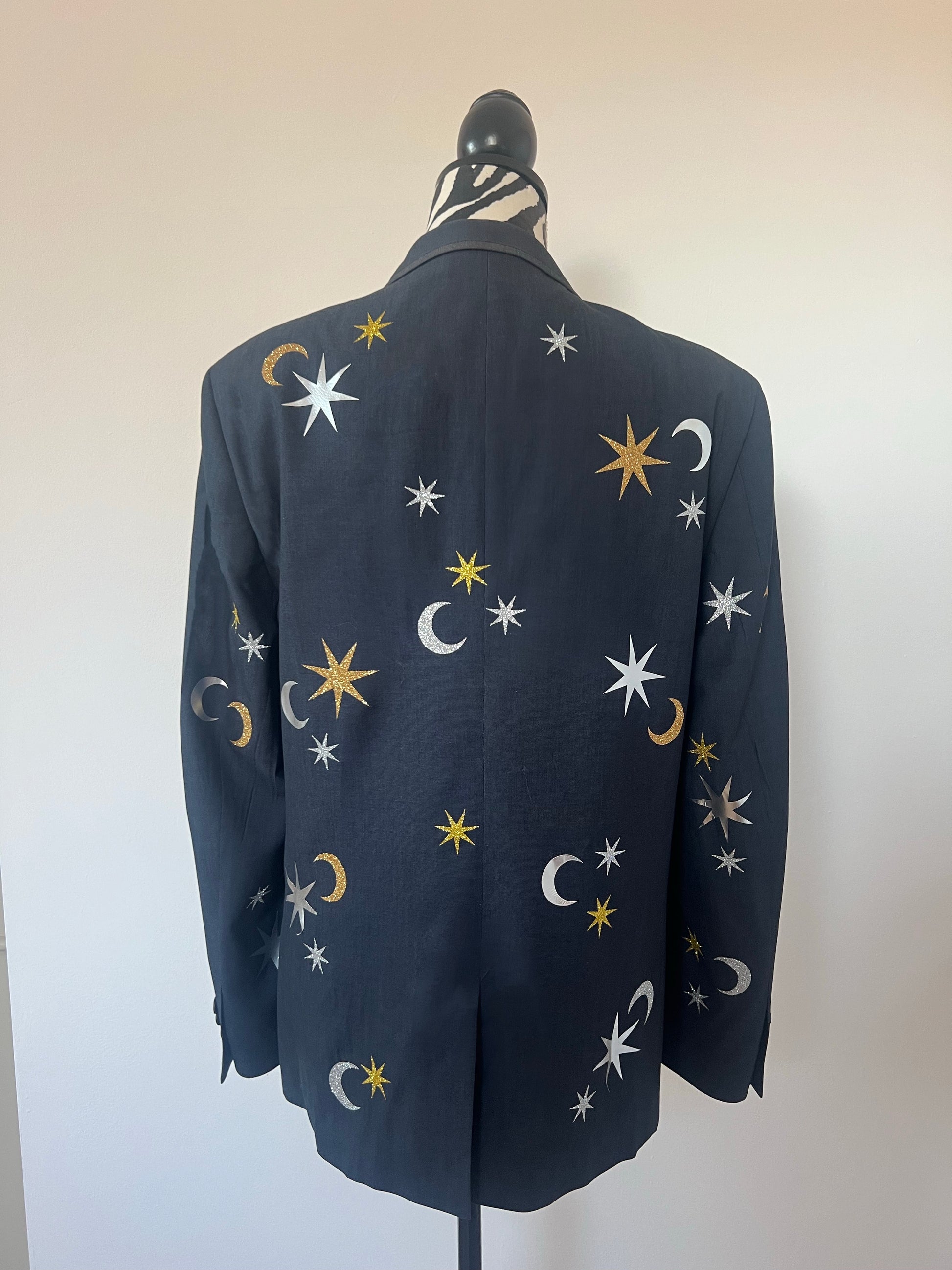 Second hand mens navy and grey blazer, decorated with gold and silver stars and moons.
