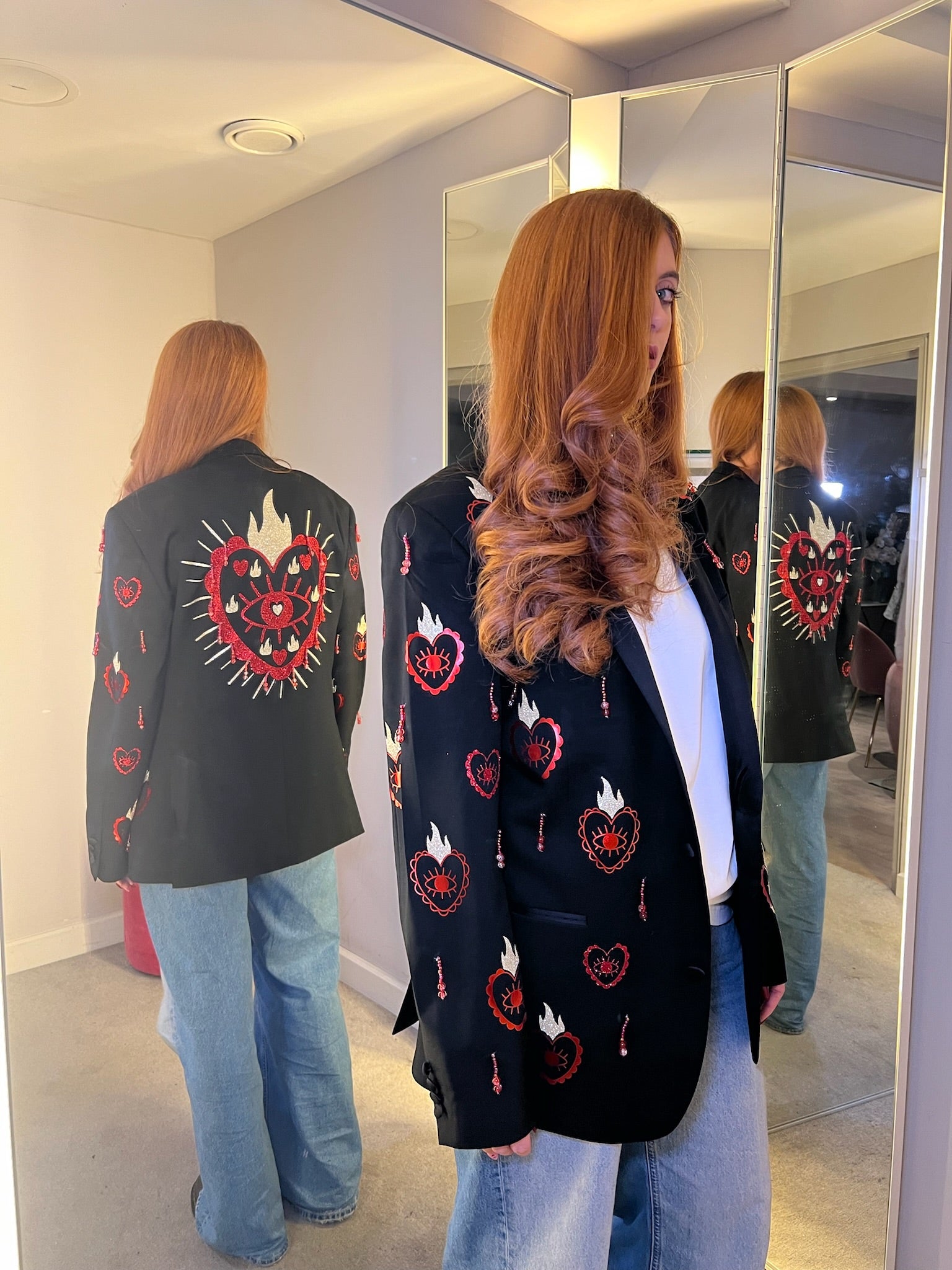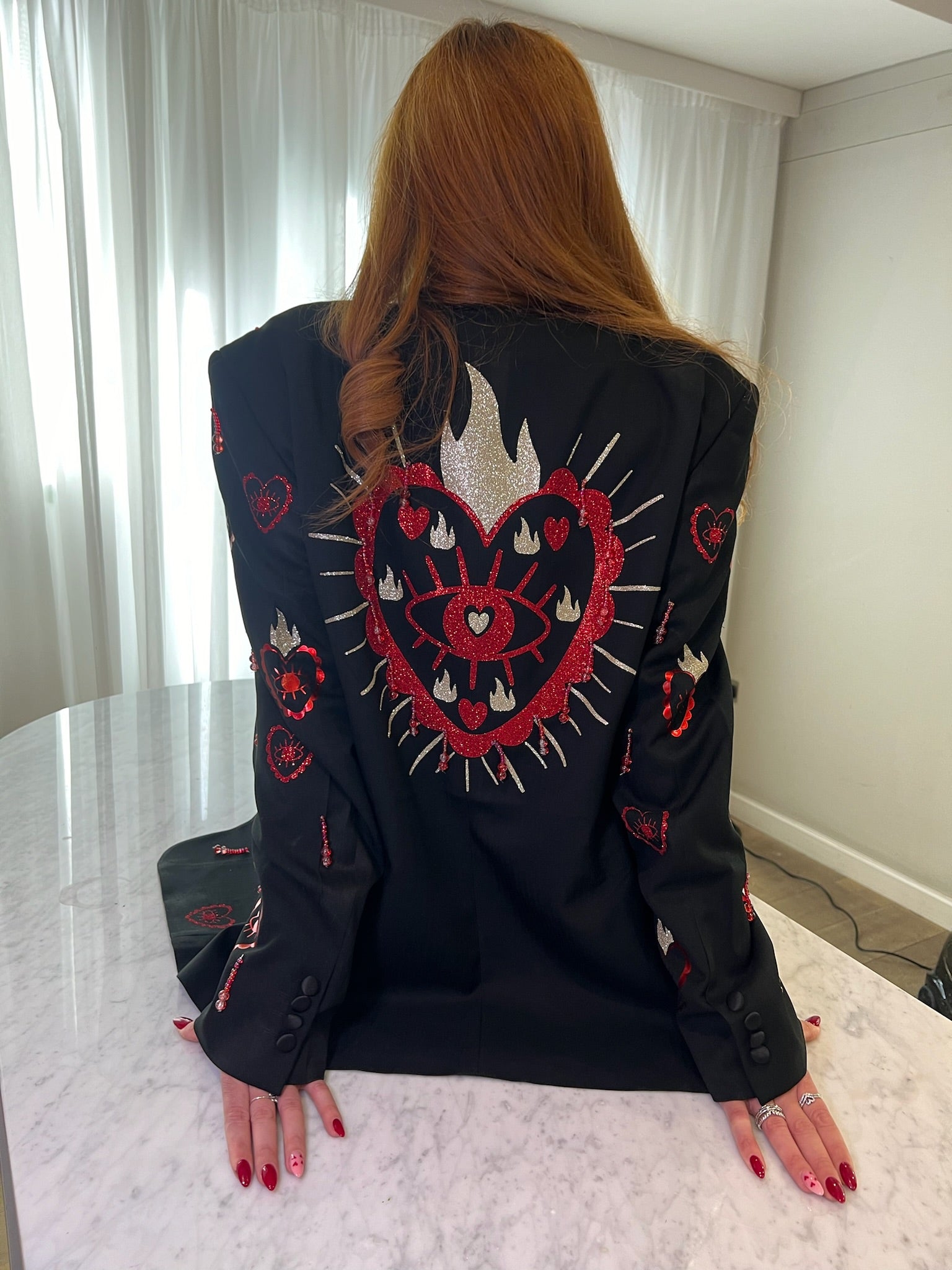 Black dinner jacket, decorated in red metallic hearts, gold flames, and hand beaded red jewels. Together creating this stunning piece.