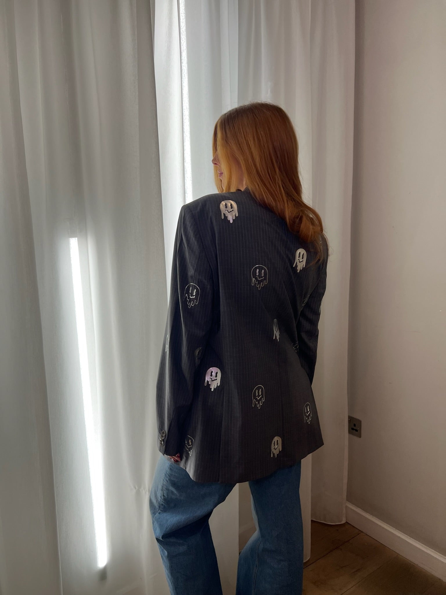 Grey pinstriped blazer decorated with silver metallic smileys.