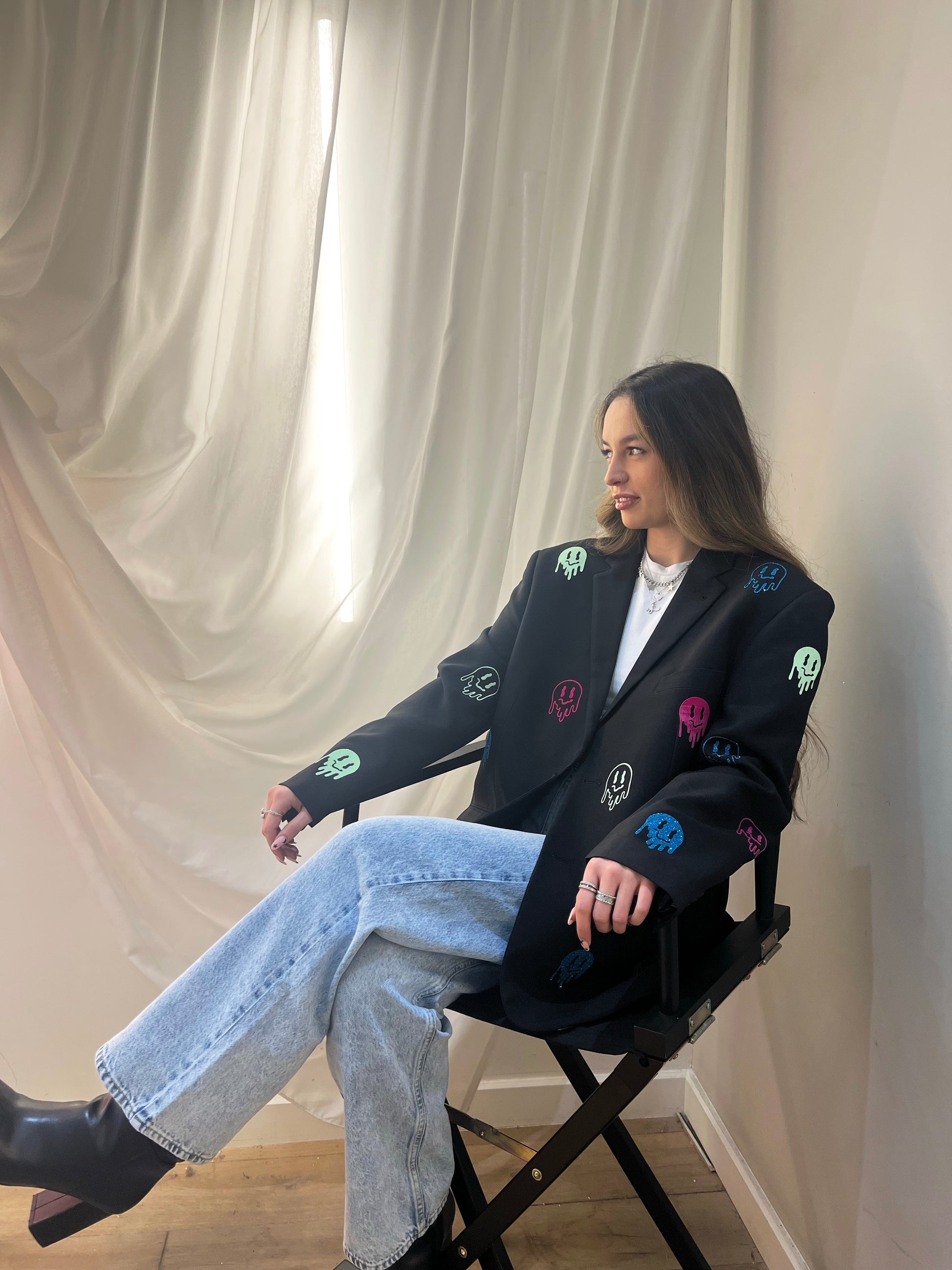 Second hand mens blazer decorated with blue, green and pink smileys.