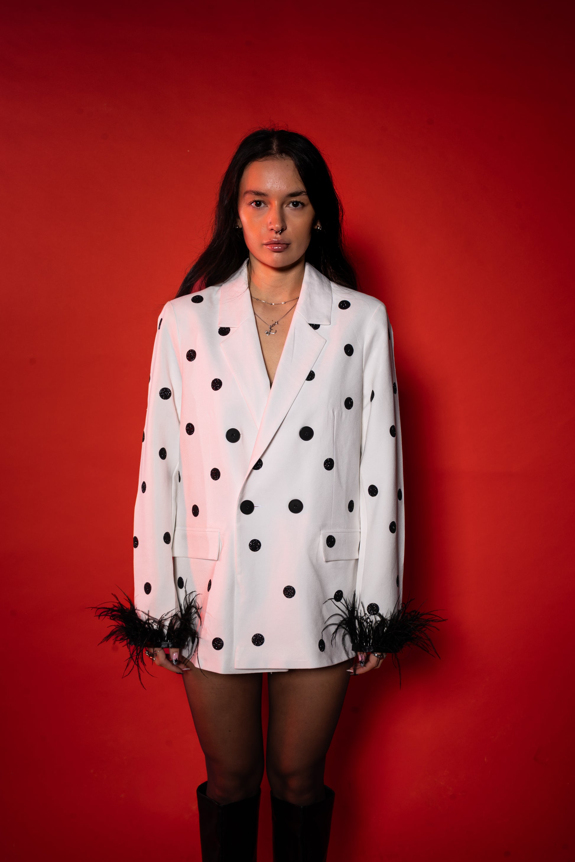 Polka dot is the pattern of the year! Perfect with jeans, skirts or on it's own this white double breasted blazer is printed with black sparkly polka dots. Finished with black feather trim around the cuff.